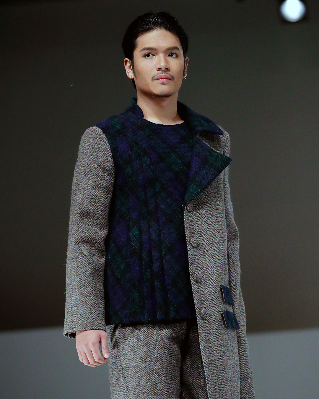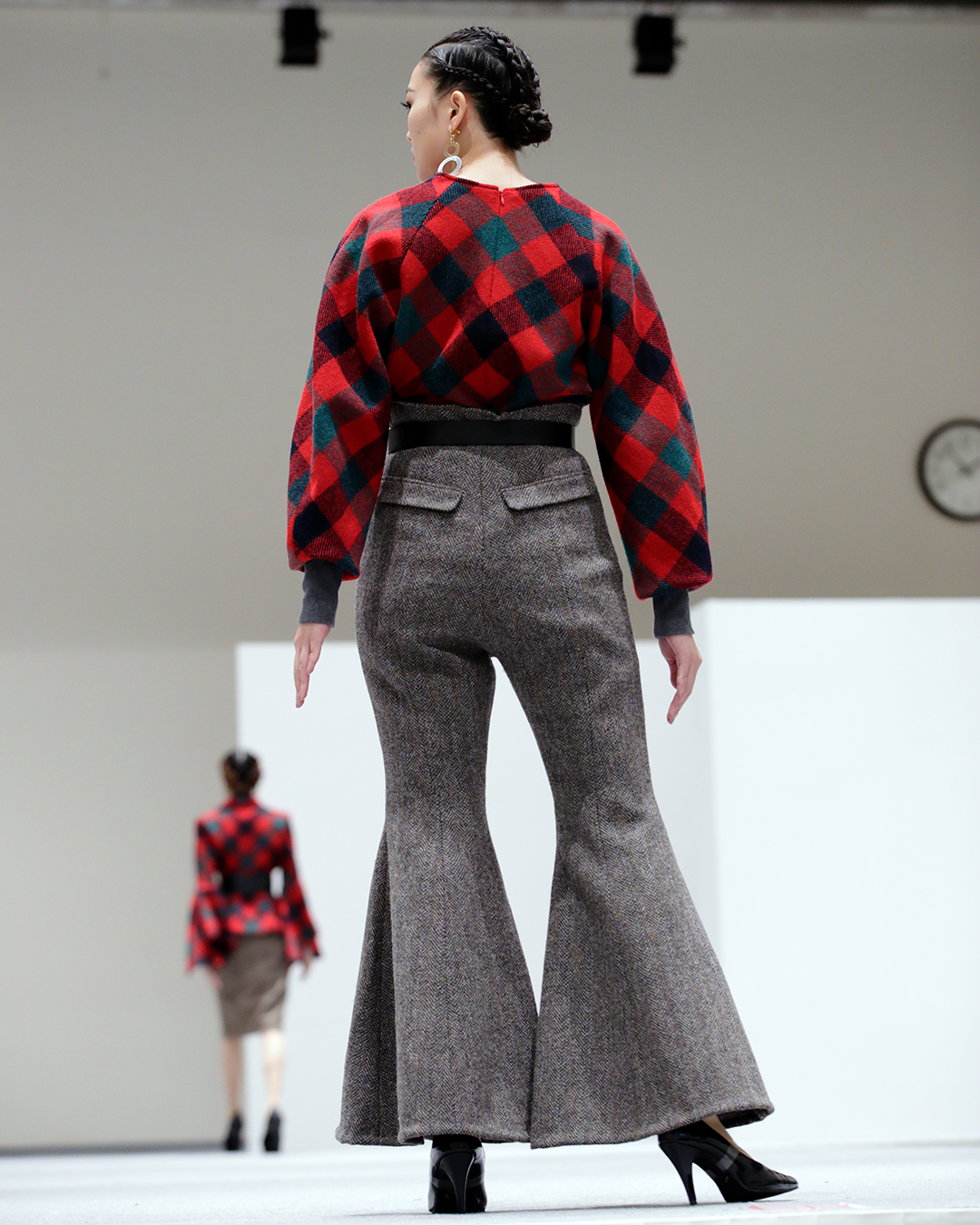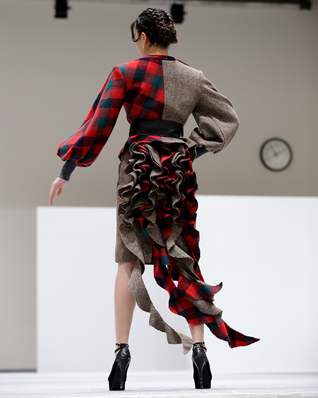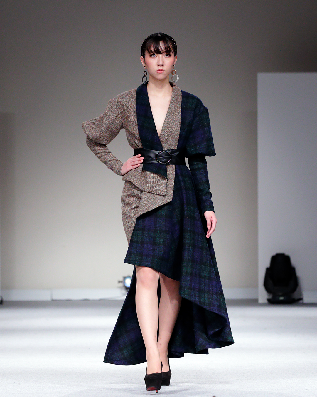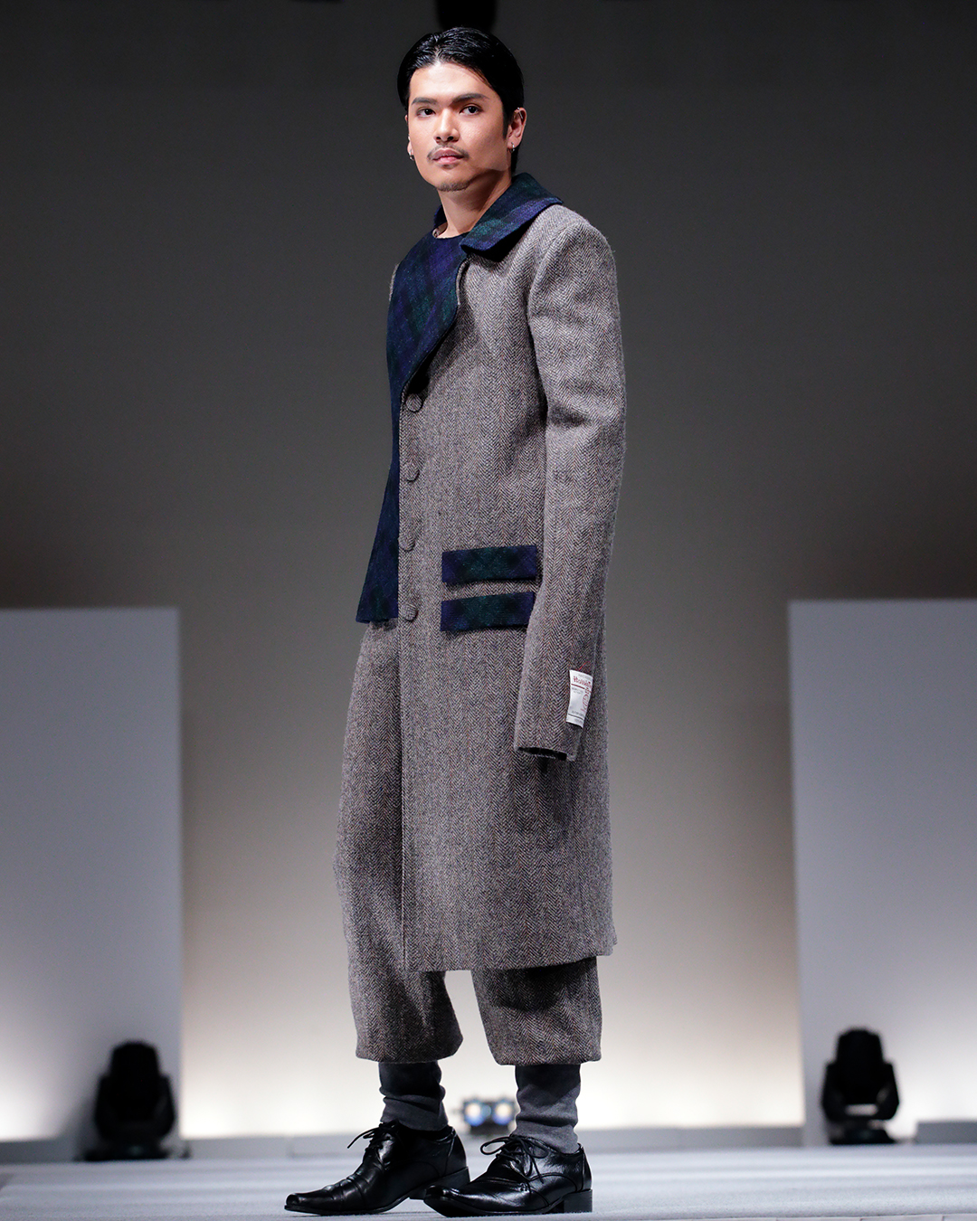 The HTA’s Educational Trust (HTAET) was delighted to support the “Σ Sigma” fashion show by donating the required Harris Tweed® cloth. The 6-month project was meticulously planned, and you can see an example of how close the designs came to their original sketches. The final outfits were a unique Japanese take on traditional Scottish garments, incorporating various techniques of layering and pleating.
