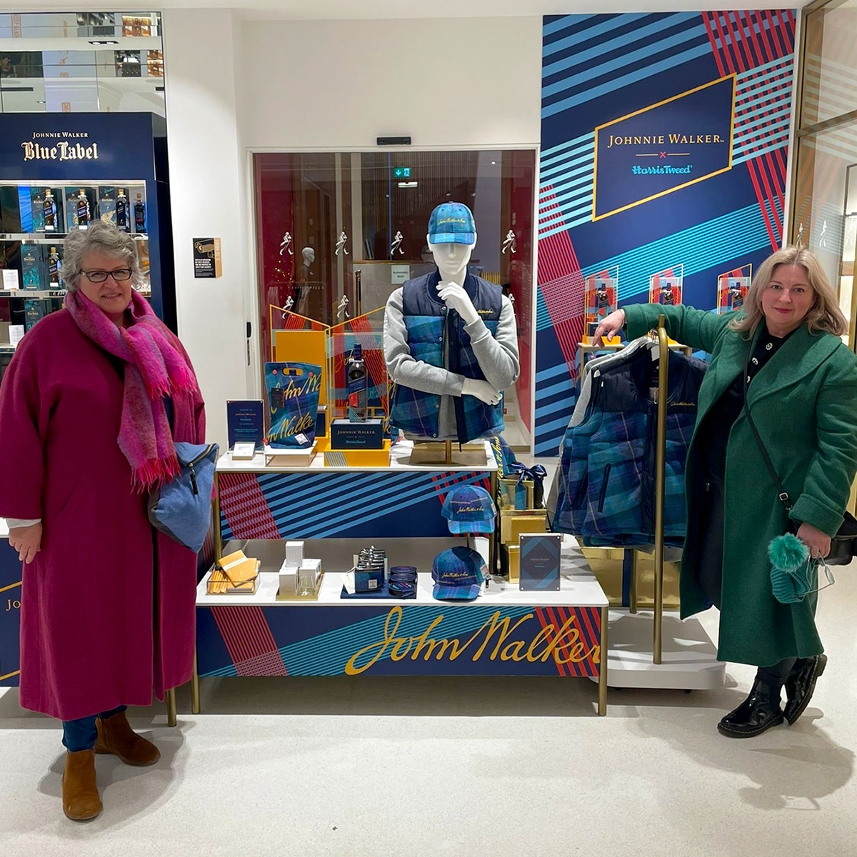 Passing through Edinburgh in -7 temperatures, our CEO Lorna and Office Manager Kristina warmed up by visiting the wonderful Johnnie Walker Experience on Princes St. There they were able to sample the new Johnnie Walker x Harris Tweed Hebrides blend and try for size the collection of beautiful accompanying Harris Tweed® merchandise that has been developed with our colleagues at Harris Tweed Hebrides.